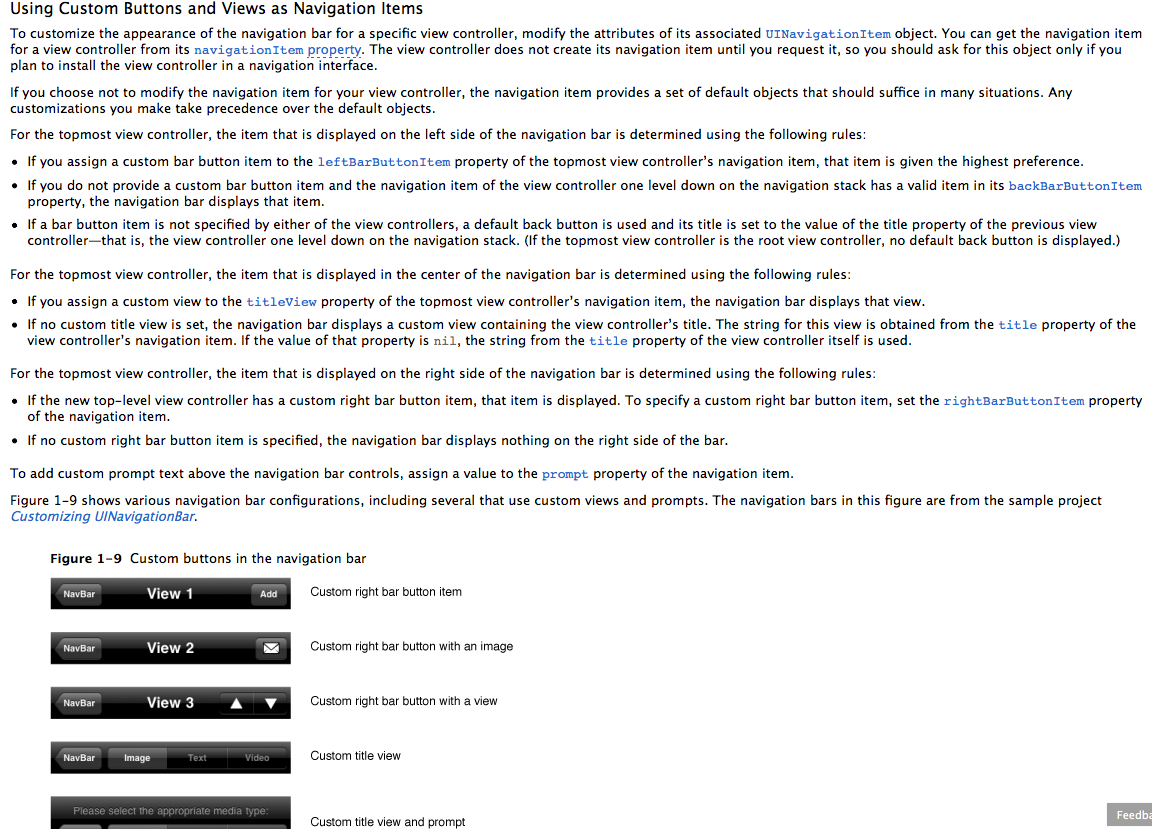 UIBarButtonItem提供了创建UIBarButtonSystemItem的方法,也提供创建自定义视图的方法 - initWithCustomView:,所以想要完全自定义UIBarButtonItem,则可以使用创建自定义视图的方法,先生成一个按钮,自定义按钮,最后在通过initWithCustomView将按钮转化成UIBarButtonItem.