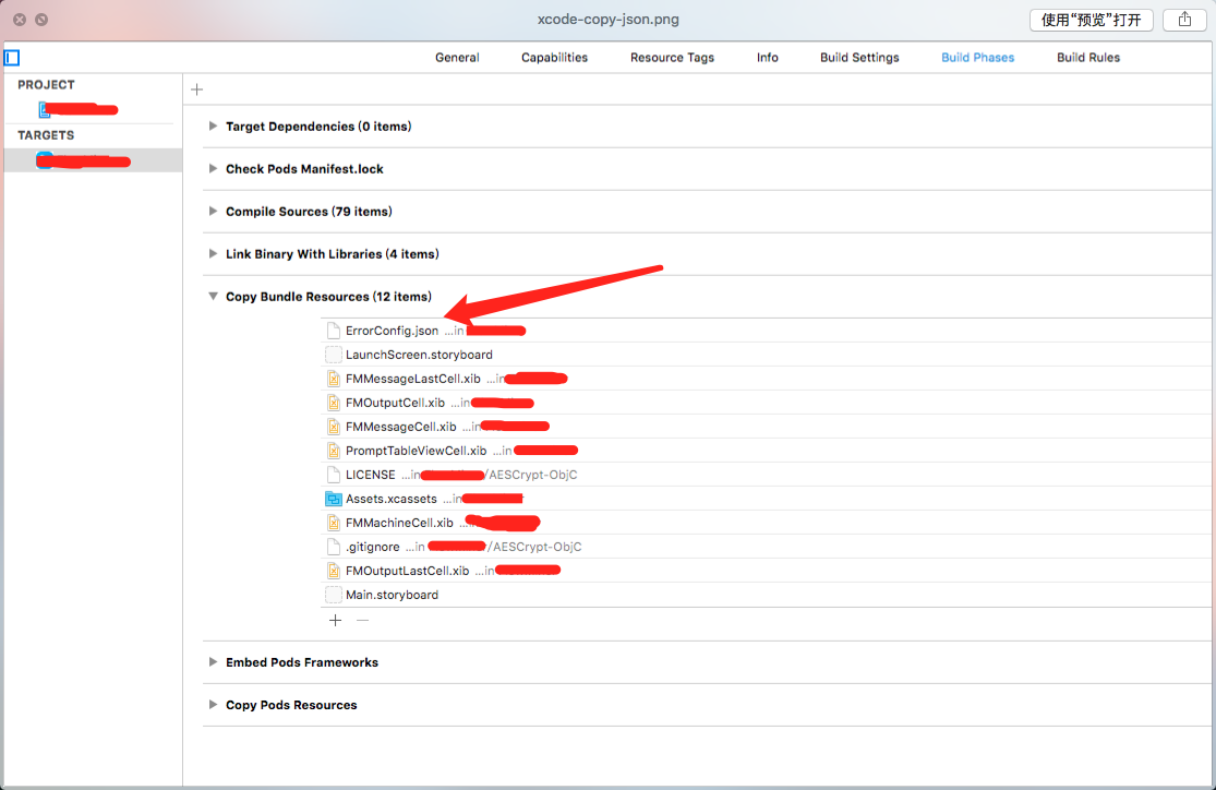 解决方案:对于.json或其他类似格式的文件,需要自己在Xcode中的Targets->Build Phases->Copy Bundle Resources中将.json文件选入.