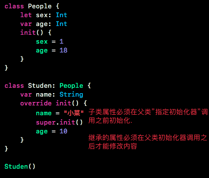 Swift和OC不一样,Swift默认是不会继承父类的初始化器(只有特定情况才会). Swift的这种机制防止父类的简单初始化器被一个更专用的子类继承并被用来创建一个没有完全或错误初始化的新实例的情况发生。