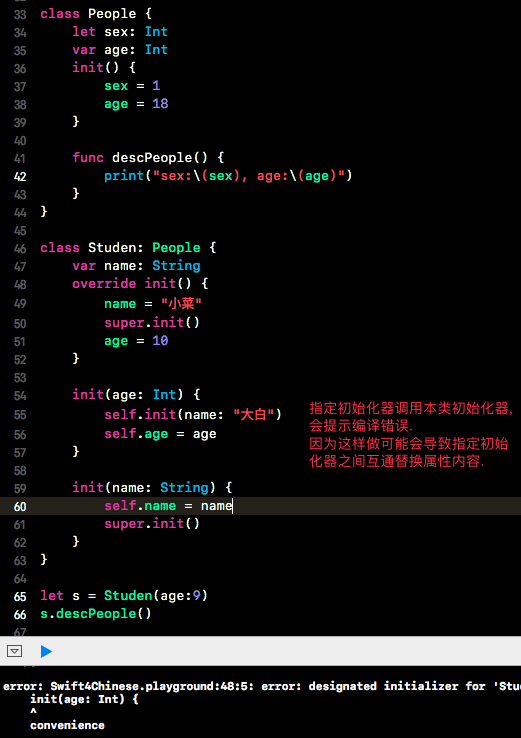 初始化器的概念应该类似构造函数,用来初始化对象属性.在Swift中,一共有两种初始化器,分别是指定初始化器和便捷初始化器.这两种类型的初始化器可就大有区别了,为了确保类链(类继承)各个类的正确初始化,Swift团队为其设计了一套非常严谨的语法.