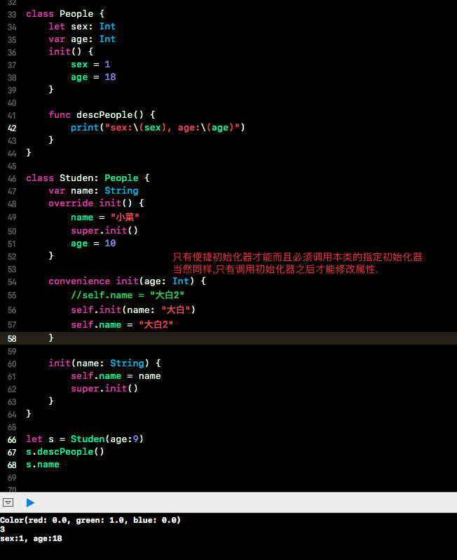 初始化器的概念应该类似构造函数,用来初始化对象属性.在Swift中,一共有两种初始化器,分别是指定初始化器和便捷初始化器.这两种类型的初始化器可就大有区别了,为了确保类链(类继承)各个类的正确初始化,Swift团队为其设计了一套非常严谨的语法.