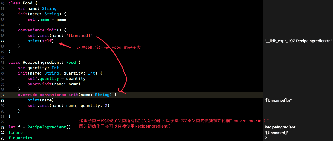 2. 如果你的子类提供了所有父类指定初始化器的实现——通过在定义中提供自定义实现的——那么它自动继承所有的父类便捷初始化器。就算你的子类添加了更多的便捷初始化器,这些规则仍然适用。