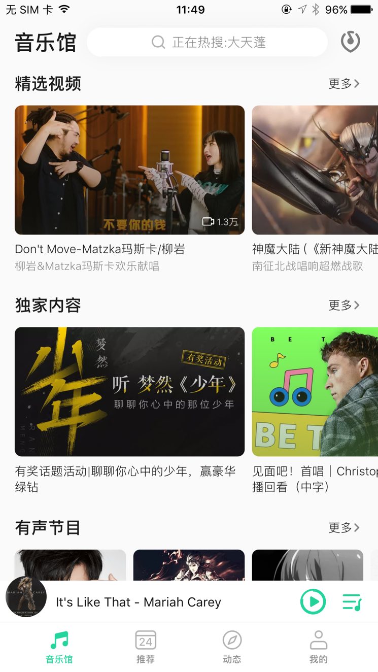 QQ音乐的搜索框会随着页面向上移动而移动, 但是页面向下移动的时候, 搜索框则固定不动. 所以这里采用一个独立的UIView, 存放搜索框也左边的音乐馆label, 以及右边的Logo