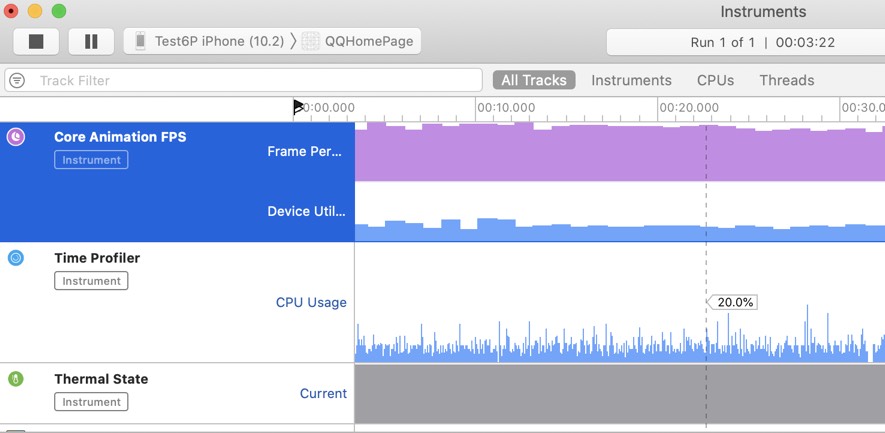 不过有一点让我觉得奇怪的是, 屏幕上显示的FPS一直是60, CPU占有率只有15%, 这种卡顿很容易让人猜出来是GPU处理不过来. 因为FPS指示器用的是CADisplayLink加一个整形变量实现的, 计算出CADisplayLink每秒调用的次数就是帧率. 既然这个FPS一直是60, 那么意味着CPU还是能处理的过来的.
