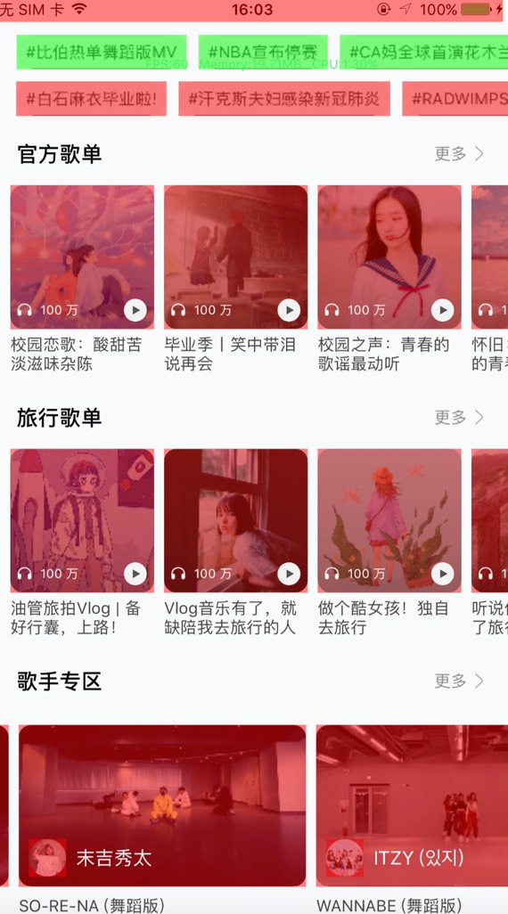 往下的可以横向滚动的视图都用UICollectionView实现, 其中分为多种不同的Cell. QQ音乐首页的Cell种类是后台配置的, 我这里只挑选其中几种实现, 其他的都是一样的道理.
