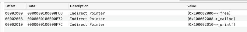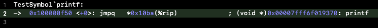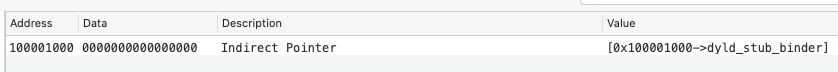 第二次调用_printf时, 就可以正确跳到该符号在动态库中的真实地址了. 通过下面lldb调试指令memory read 0x100002010 , 可以读取到里面保存的符号真实地址