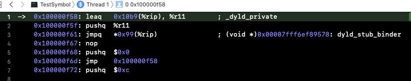 可以看到xcode帮我们注释出来的两个符号, 其中dyld_stub_binder是动态库里的函数, 而且已经被bind好地址了.