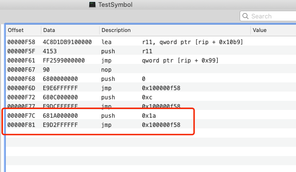 先push一个常数0x1a到栈上(这个常数Dynamic Loader Info -> Lazy Binding info -> Actions的偏移, 根据这个参数可以找到具体符号), 然后跳到0xf58这个地址上, 也就是上图第一行. 直接看, 看不出含义, 直接调试汇编可以看到xcode的注释.