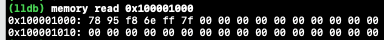 调试程序, 直接读取0x100001000地址的内存数据, 可以看到被内容已经不是0了, 而是真实地址 0x7fff6ef89578