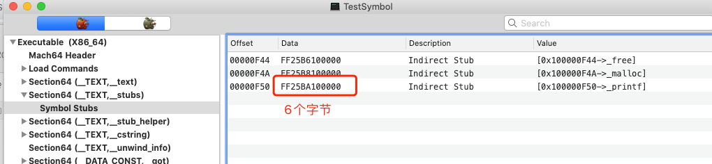 在TEXT区域(代码区), 可以看到编译器为动态库的符号设置了对应的stub, 每个stub占用6个字节(仅指x64编译出来), 存放的是一条汇编指令jumq.(编译后的程序存放的都是机器码, 反编译后就可以看到汇编指令), 代码中调用函数, 被编译之后, 汇编指令就是调用这个函数对应的stub