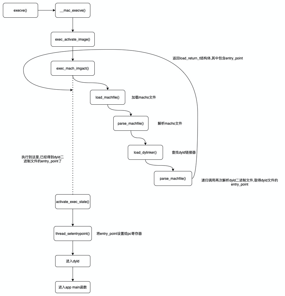 launchd进程启动用户App launchd在启动其他进程时,会通过fork() 系统调用,进入内核态克隆出另一个launchd进程,再通过execve 系统调用,传入目标App的二进制文件的路径。execve 函数内部会有一些列调用,参考下面这个调用图: