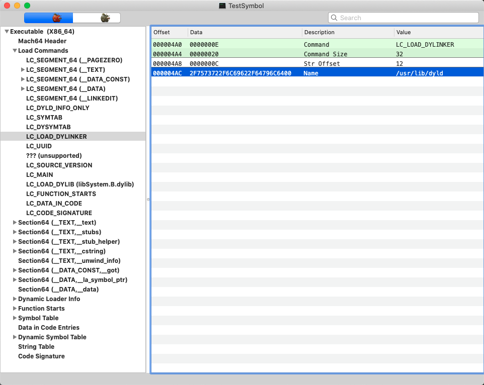 重点看上面中文注释,关于macho文件的格式网上大把文章可以自行查看,macho文件的cmd部分,会指明当前二进制文件需要采用的动态加载器的路径。